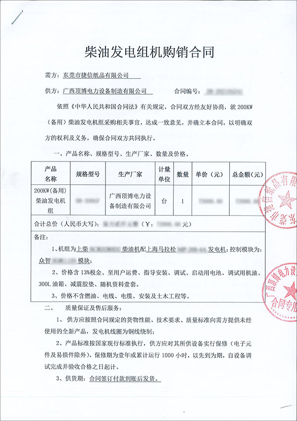 2021年5月24日,廣西頂博電力設(shè)備制造有限公司與東莞市捷信紙品有限公司成功簽訂一臺(tái)200kw上柴柴油發(fā)電機(jī)組,該臺(tái)機(jī)組將作為備用電源,在市電停電時(shí)能迅速為貴公司提供穩(wěn)定的交流電源,保證生產(chǎn)工作不受影響。