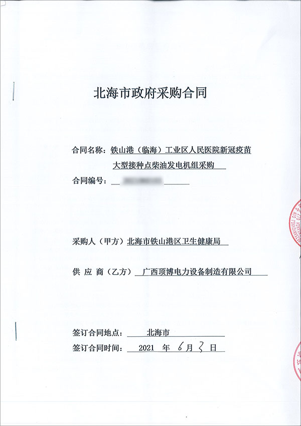 2021年6月3日,廣西頂博電力設(shè)備制造有限公司與北海市鐵山港區(qū)衛(wèi)生健康局成功簽訂一臺(tái)500KW玉柴柴油發(fā)電機(jī)組,用于鐵山港(臨海)工業(yè)區(qū)人民醫(yī)院新冠疫苗大型接種點(diǎn)。我司將認(rèn)真履行合同約定,承諾自合同簽訂之日起15天內(nèi)完成安裝、調(diào)試,驗(yàn)收合格后交付使用。