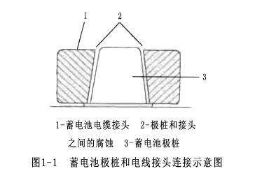 故障分析與診斷:通常,在起動時(shí)臟污的蓄電池極樁限制了極樁和蓄電池電纜接頭之間強(qiáng)電流的通過,如圖1-1所示。腐蝕現(xiàn)象出現(xiàn)在頂部或側(cè)面的極樁上。