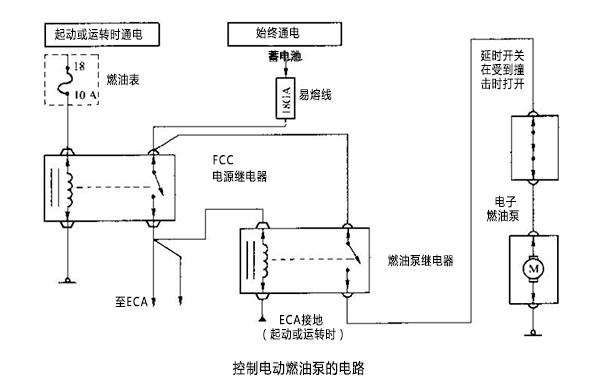 下圖顯示的是控制電動燃油泵的電路。電流從蓄電池輸出,然后流到易熔線(圖中間)。易熔線與燃油泵繼電器相連。點(diǎn)火開關(guān)接通時,ECC電源繼電器內(nèi)的線圈通電,使ECC電源繼電器開關(guān)閉合。當(dāng)電源繼電器開關(guān)閉合時,燃油泵繼電器線圈會接著通電。一旦通電,泵繼電器開關(guān)就會閉合,然后電流通過一個常閉的延時開關(guān)。隨后,電流通向電動燃油泵,使泵電動機(jī)運(yùn)轉(zhuǎn)。延時開關(guān)是一個安全裝置,只要發(fā)動機(jī)受到意外撞擊或發(fā)生事故,都會斷開電路。這樣防止發(fā)生碰撞時,燃油泵繼續(xù)輸送或?yàn)R出燃油。
