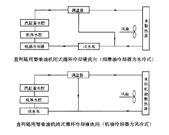 2、閉式循環(huán)冷卻系統(tǒng)。所謂閉式循環(huán)冷卻系統(tǒng),就是柴油發(fā)電機(jī)冷卻系統(tǒng)本身自成完整的封閉循環(huán)回路、陸用柴油機(jī)的閉式循環(huán)冷卻系統(tǒng)即從柴油機(jī)出來的高溫冷卻液,通過水散熱器靠風(fēng)扇強(qiáng)力鼓風(fēng)來冷卻,冷卻后的水再去冷卻柴油機(jī):閉式循環(huán)冷卻系統(tǒng),按機(jī)型和使用機(jī)油冷卻器的不同而有所不同,如下圖所示。