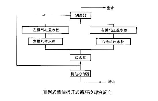 1、開式循環(huán)冷卻系統(tǒng)。開式循環(huán)冷卻系統(tǒng)即柴油機(jī)的進(jìn)出水口為開式,使用時(shí)由用戶自行接通水源。根據(jù)柴油機(jī)機(jī)型和機(jī)油冷卻器的布置不同,組成開式循環(huán)冷卻系統(tǒng)的形式也稍有區(qū)別。其冷卻液流向如下圖所示。